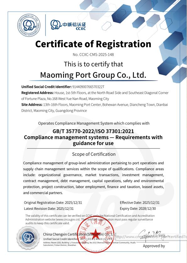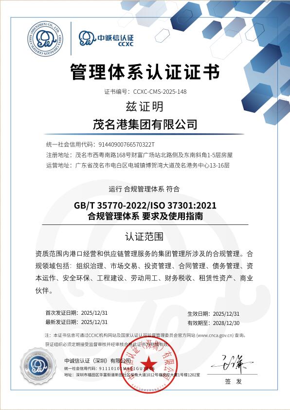 近日,茂名港集團有限公司成功通過權(quán)威認(rèn)證機構(gòu)審核,榮獲ISO 37301:2021合規(guī)管理體系國際標(biāo)準(zhǔn)認(rèn)證與GB/T 35770-2022合規(guī)管理體系國內(nèi)標(biāo)準(zhǔn)認(rèn)證。這標(biāo)志著茂名港集團在合規(guī)管理體系建設(shè)方面達(dá)到了國際國內(nèi)先進(jìn)水平,成為茂名市首家獲得合規(guī)管理體系認(rèn)證的市屬國有企業(yè),在企業(yè)治理現(xiàn)代化與規(guī)范化道路上邁出了具有里程碑意義的關(guān)鍵一步。