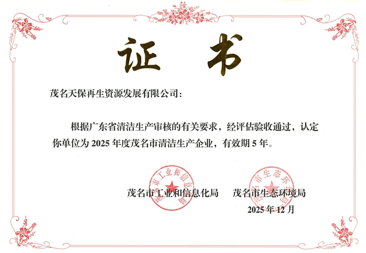 近日,茂名天保再生資源發(fā)展有限公司(以下簡稱“天保公司”)正式確定為茂名市2025年度清潔生產(chǎn)企業(yè),該認(rèn)定有效期為5年。